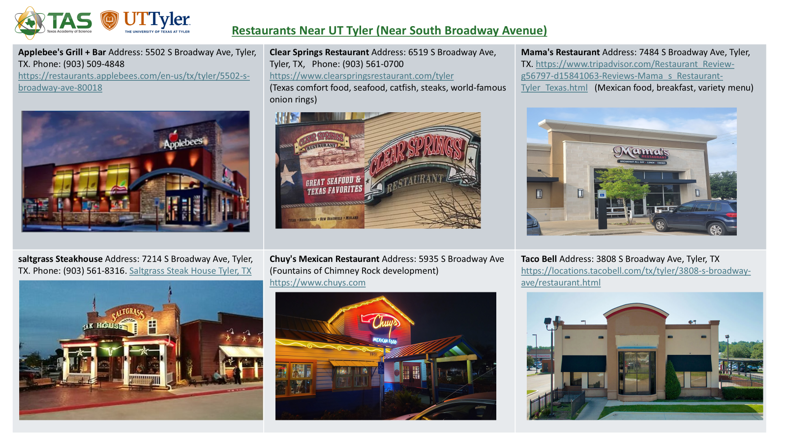 The 2026 meeting is hosted by University of Texas at Tyler. Click on the logo below to visit the school websites.